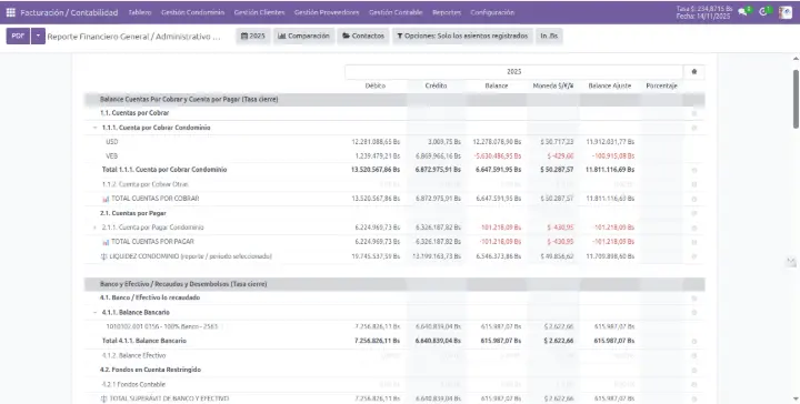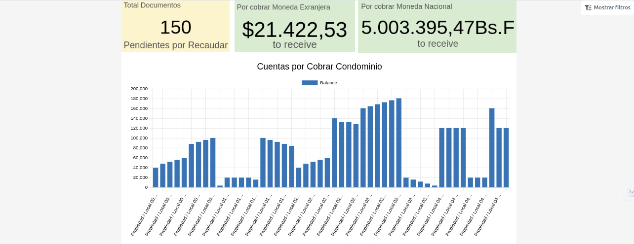 Emisión de avisos de cobro, recibos en Moneda Extranjera y Nacional acorde a la legislación del país. Reflejo de la tasa efectiva y automática en que se generan los documentos y su equivalente en moneda nacional en el sistema de condominio. Control y creación de notas de débito a razón del diferencial cambiario, inflación, corrección monetaria, contabilidad condominio multi divisa. Reportes de transferencia online, sistema administrativo y contable para condominio.
