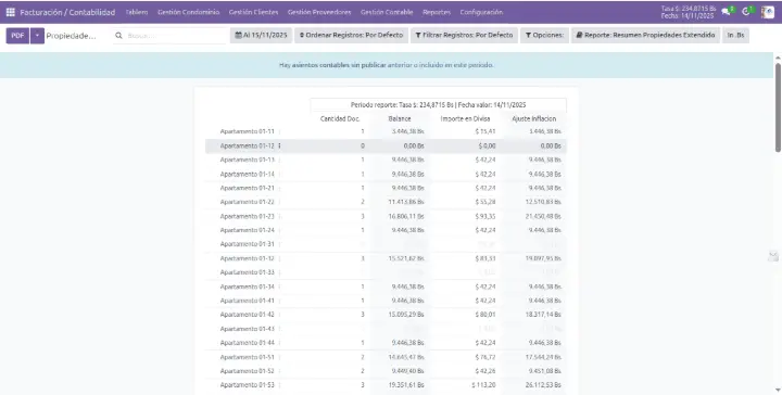 Expresión de documentos en múltiples monedas, ajuste de inflación automáticas en documentos vencidos de acuerdo a la tasa del Banco Central de País o cualquier otro tasa convenida por las comunidad de copropietarios y almacenada en el software para condominio.