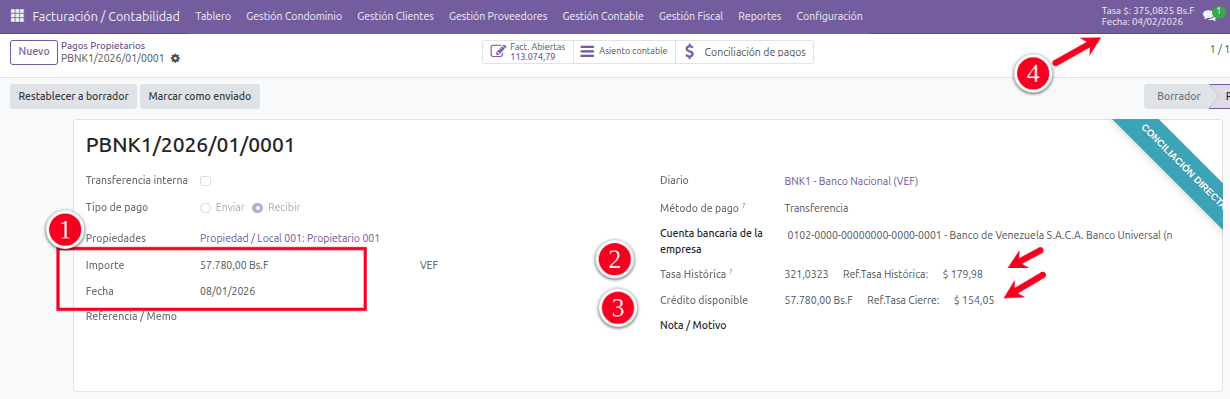Entonces, si el condominio lleva su contabilidad en bolívares, los saldos a favor se registran en bolívares a la tasa del día de la transacción y no se revalúan. Esto significa que el propietario debe pagar la diferencia cuando la tasa sube. Beneficios para el propietario, no deberá pagar la cuotas completa ya que dispone de saldo a favor.
