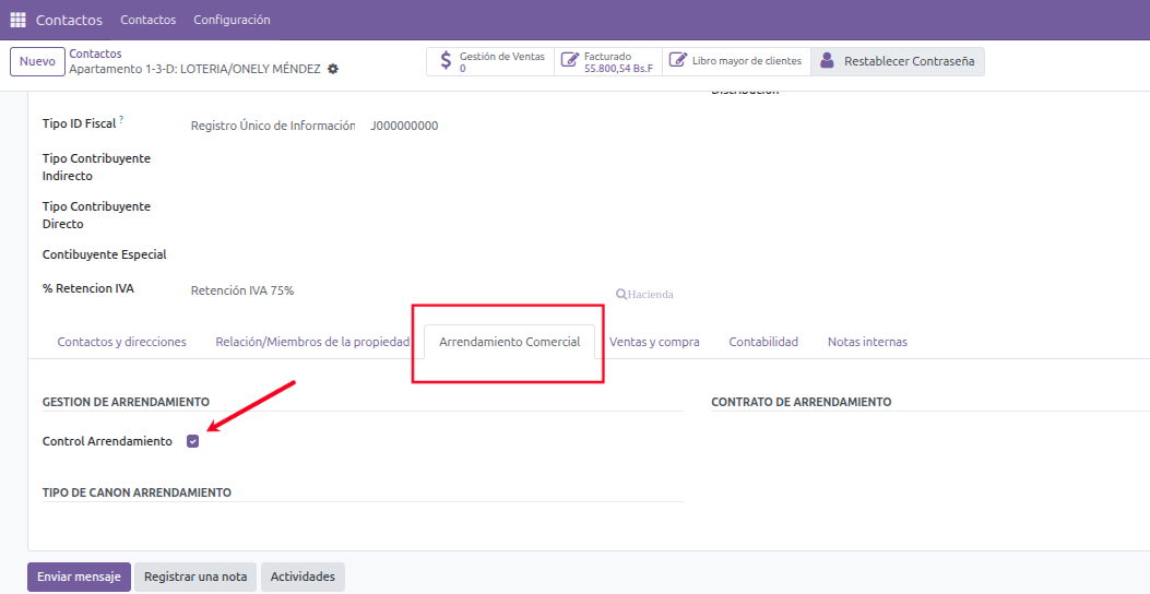 1- Entrar en la Ficha de la Propiedad, Oficina o Local Comercial, Pestaña Arrendamiento Comercial, Activar opción Control Arrendamiento