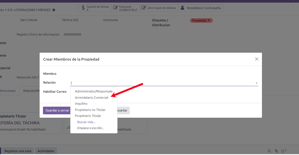 2- Entrar en la pestaña de Relación/miembros de la propiedad y agrear relación, utilizar la opcion relacion: Arrendatario Comercial