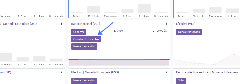 4.1 Iniciar Conciliación: En el diario de Banco, verás el aviso: "Conciliar 1 elemento". Haz clic allí.