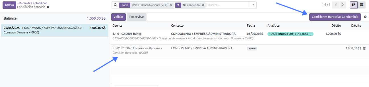 Este procedimiento aplica únicamente para la modalidad de Banco Conciliación Directa, donde los pagos se registran sin utilizar cuentas puente de pagos pendientes. Si su configuración en Odoo utiliza cuentas intermedias, el proceso de registro de comisiones puede variar.