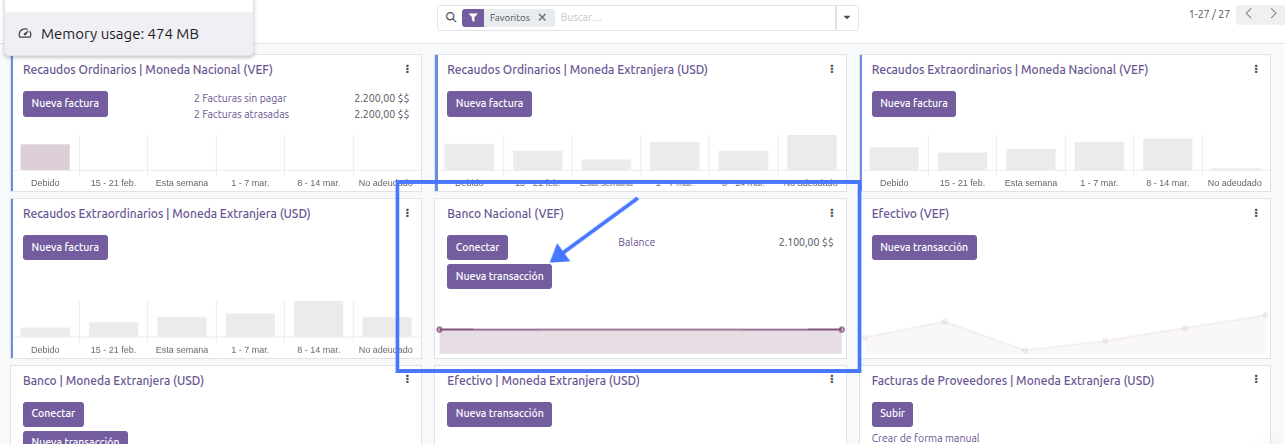Diríjase al Tablero Contable de Odoo y localice el diario correspondiente a la cuenta bancaria donde se aplicaron las comisiones. Haga clic en botón Nueva Transacción .