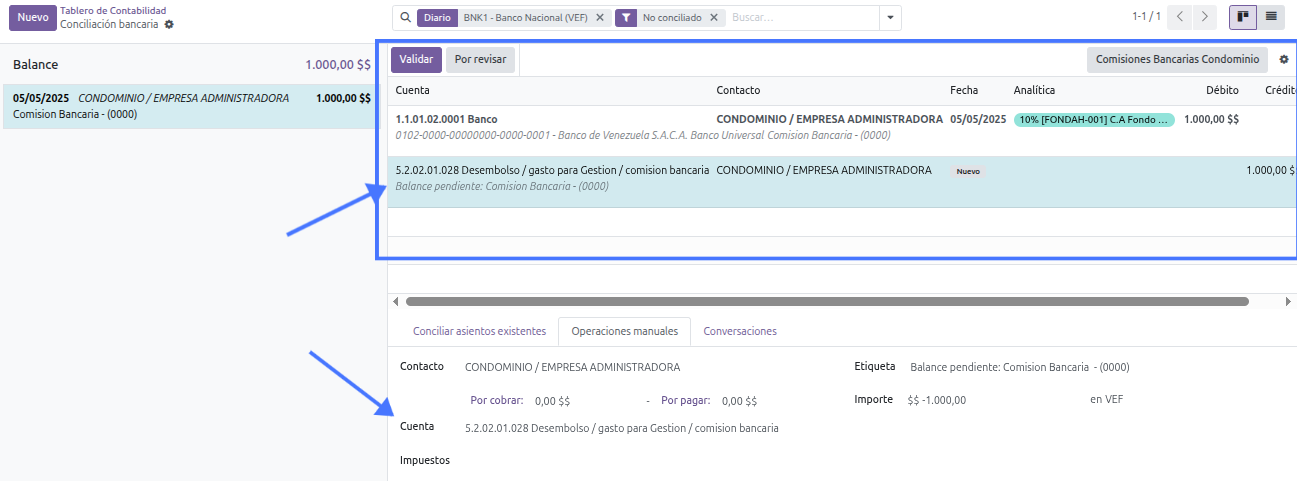 Opción Manual: En la pantalla de conciliación, ubique la pestaña o sección de "Operaciones Manuales" (o Manual Operations). Aquí deberá seleccionar la cuenta de contrapartida adecuada, que corresponde a la cuenta de gastos por comisiones bancarias del Plan de Cuentas.