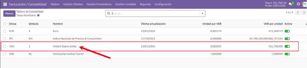 Verificar tasa del día en el sistema al comenzar la jornada administrativa.