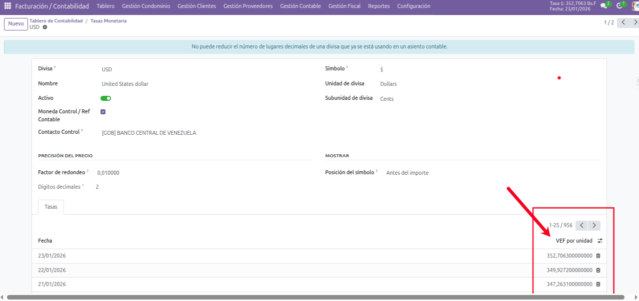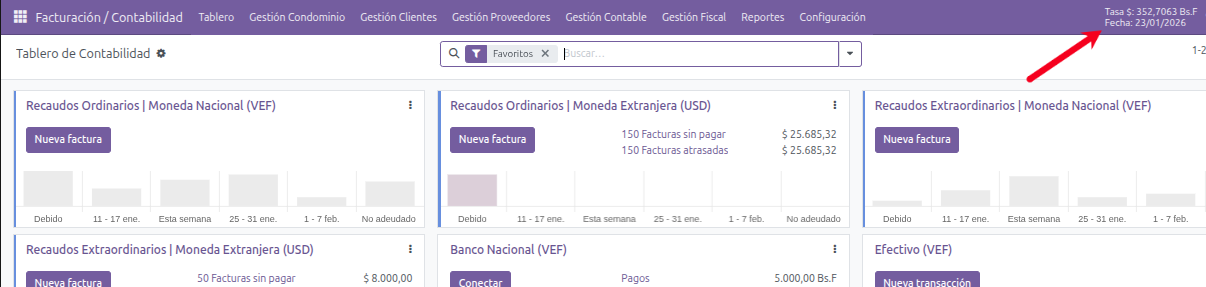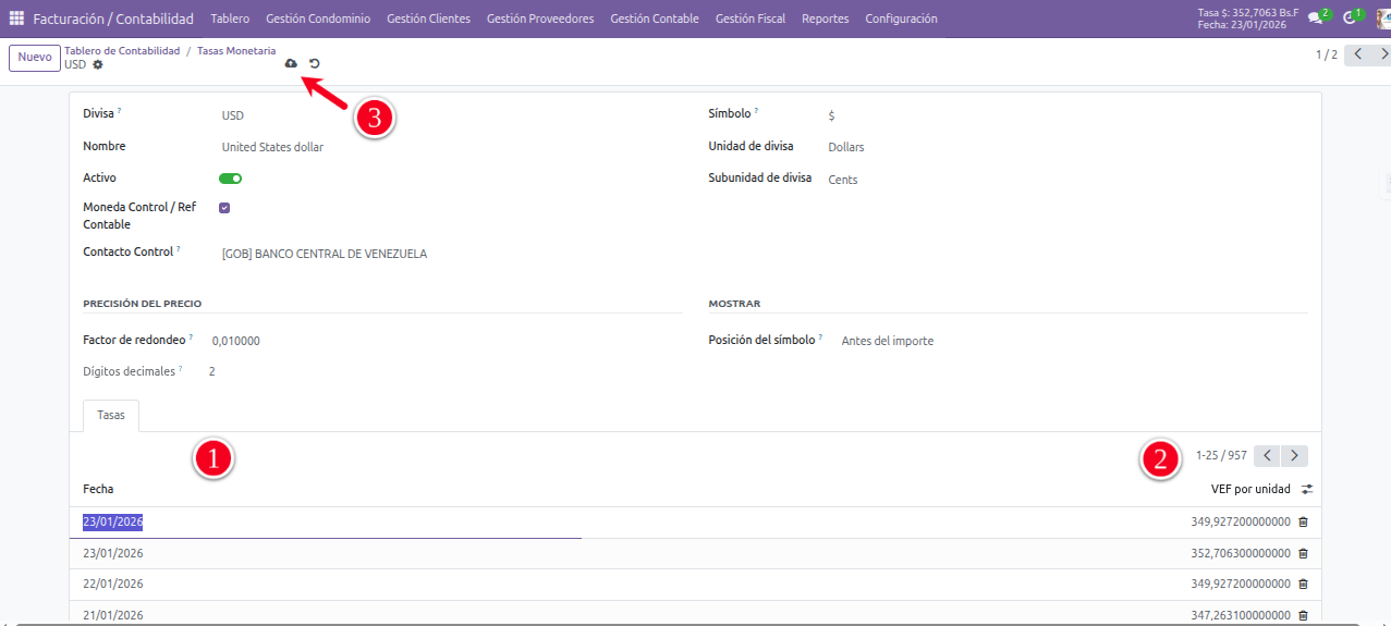 El Sistema Odoo para Condominio en primera instancia actualiza la tasa en el sistema de forma automática desde fuentes externas como la página oficial del Banco Central del País en que funciona el sistema.