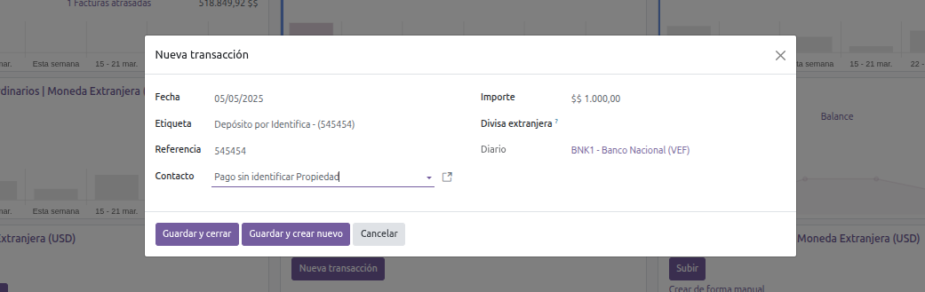 - Contacto: Puedes dejarlo vacío o usar un contacto genérico llamado "Propietario por Identificar".