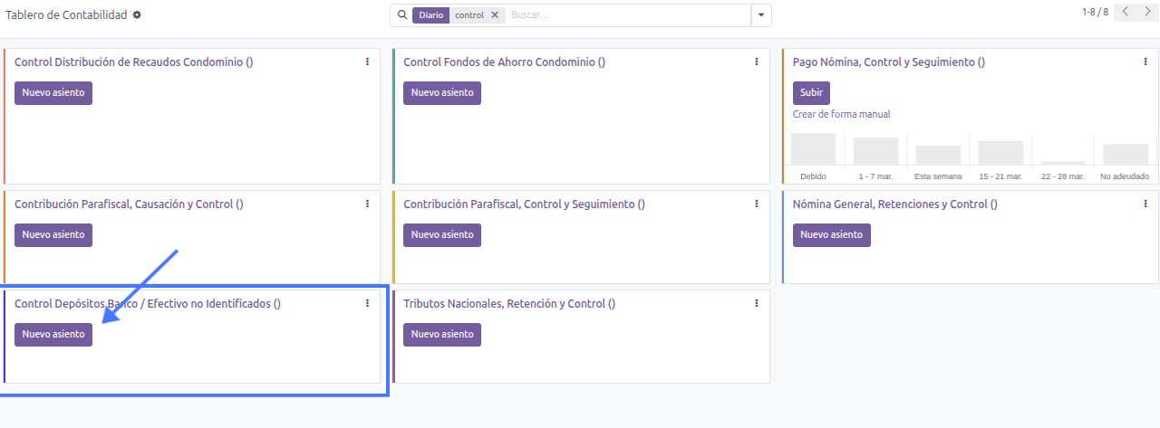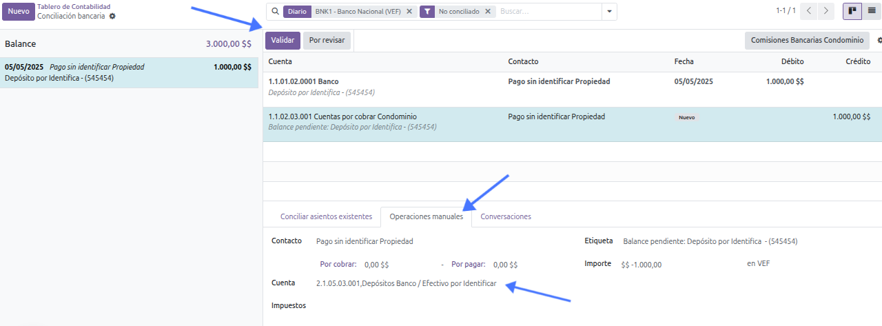 - Conciliación: Al conciliar, no busques una factura. Ve a la pestaña de Operaciones Manuales y selecciona la cuenta: 2.1.05.03.001 Depósitos por Identificar