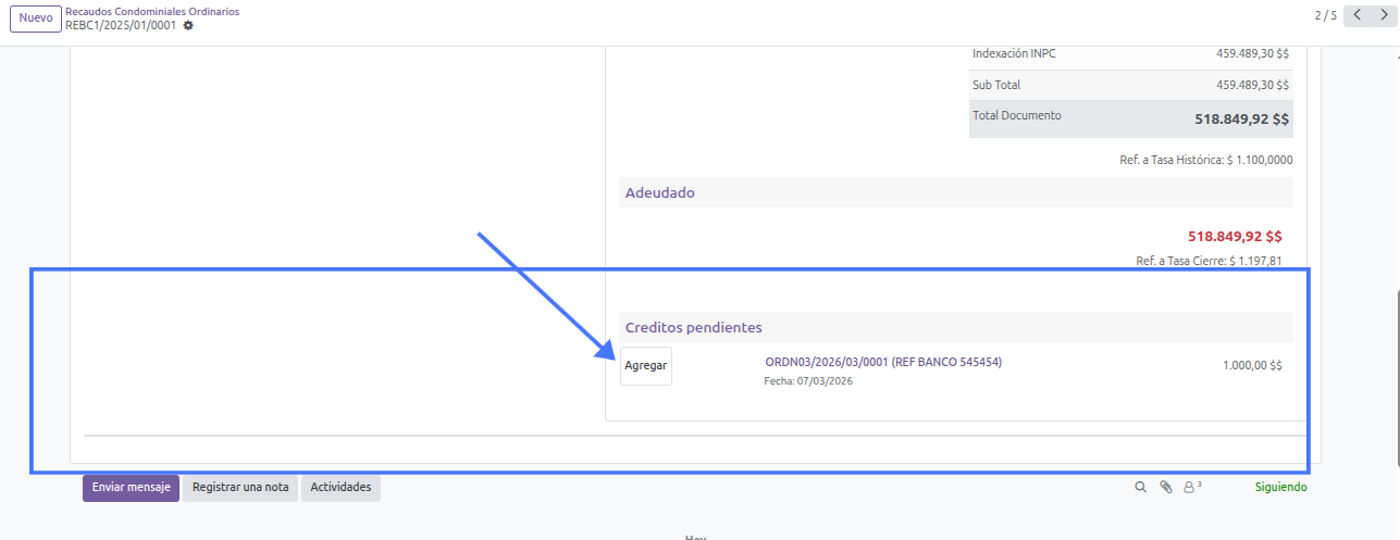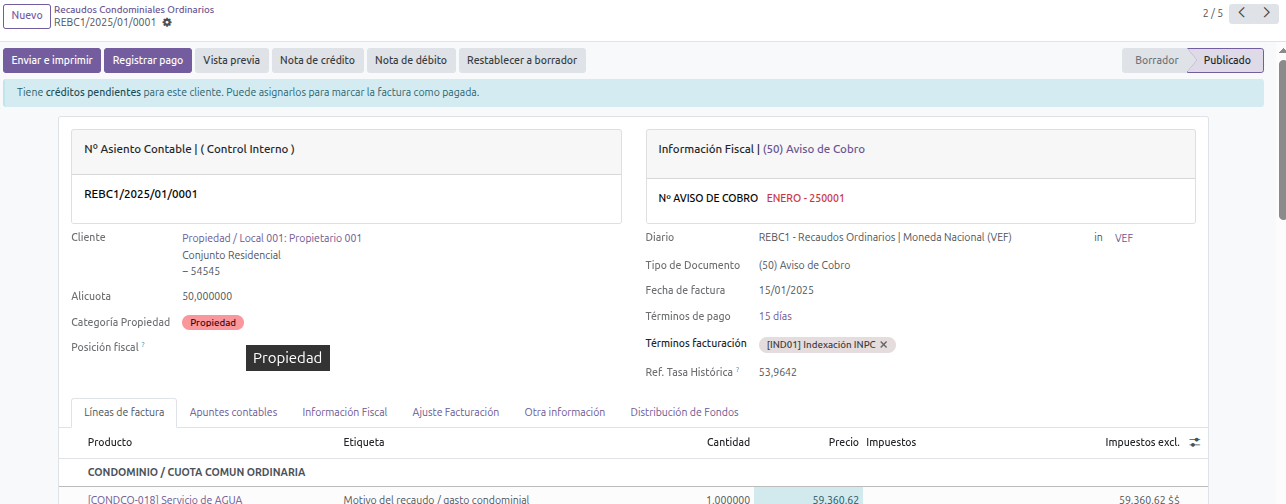 - Conciliación Interna: En Odoo Condominio, ve a los registros de deudas del Propietario XYZ y realiza la conciliación del "Crédito" que acabas de crear contra su "Factura / Recibo Pendiente".